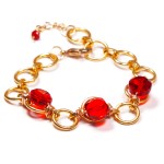 Two beads are featured in this twisted red cord bracelet, one is an oval faceted Crystal and the other is a natural faceted Labradorite stone. The charm is a small Gold Filled Leaf. The Lobster Lock ( 15×10 or 10×8 mm) and all the gold pieces are Gold Filled.