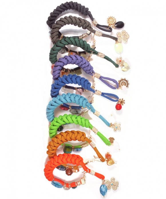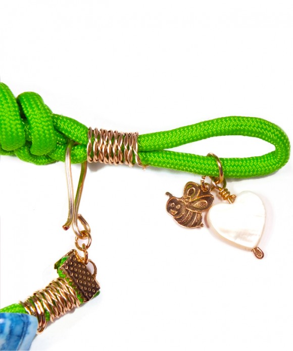 This bracelet features a light green woven parachute cord with three (3) different glass and/or stone beads and also features a bee gold filled charm ( 10 mm) and a mother of pearl small heart (12 mm).