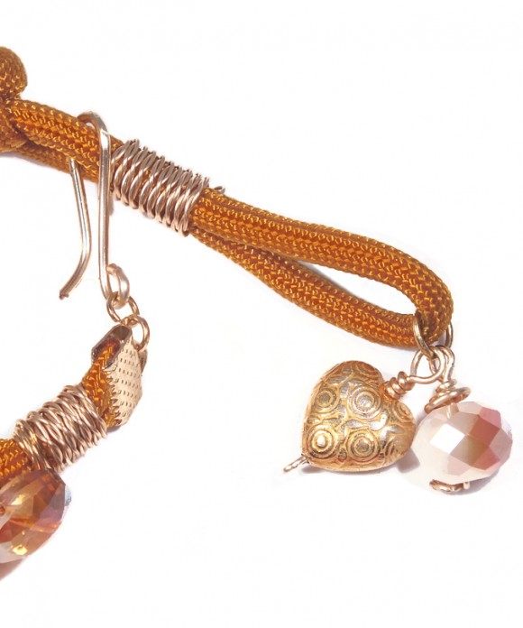 This bracelet features a mustard yellow color woven parachute cord with three (3) different glass, crystal faceted and/or stone beads and also features a gold filled heart charm ( 15 mm) and a faceted crystal rondelle (12 mm).