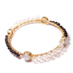 This bracelet features a black woven parachute cord with three main pieces: either glass, faceted crystal, stone or gold filled; along with two small charms at the end of the cord loop.