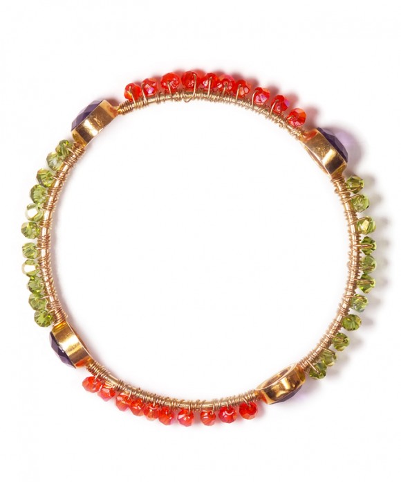 This Bracelet features a Gold Plated Bangle with four Amathyst Cabochons (10 mm) and Peridot Green Faceted Bicone and Orange Faceted Bicone Crystals beads ( 6 mm) attached.