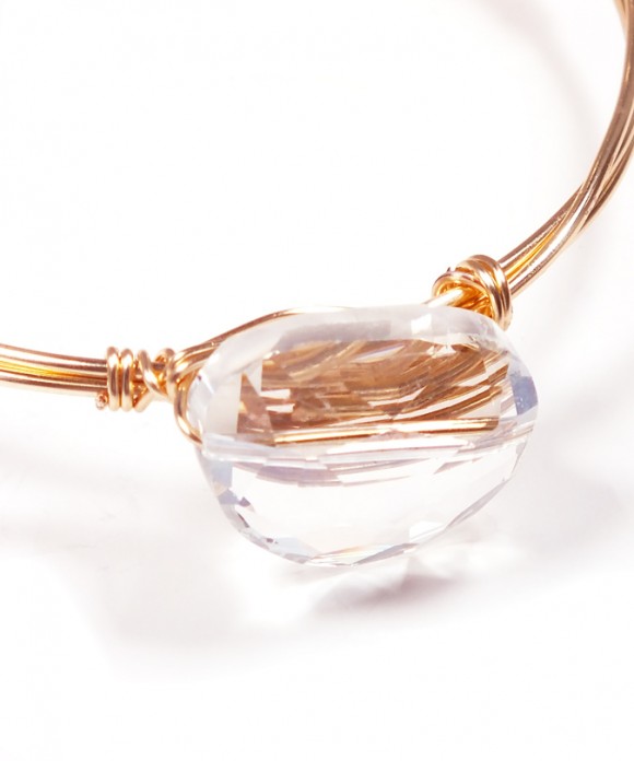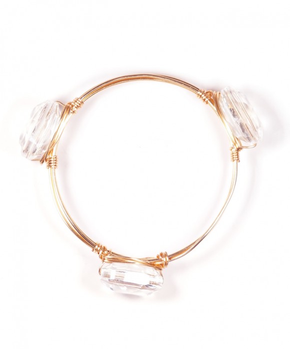 This Bracelet features a Gold Bangle with three Clear Crystal Faceted Bean Beads (20×16 mm) attached.