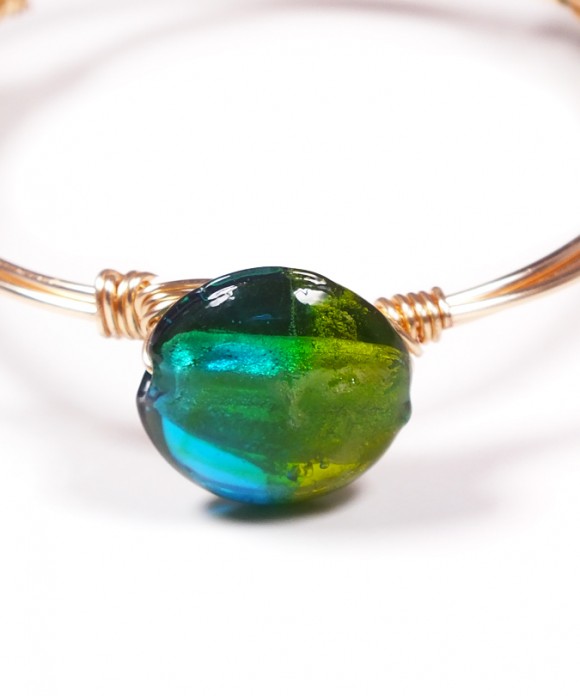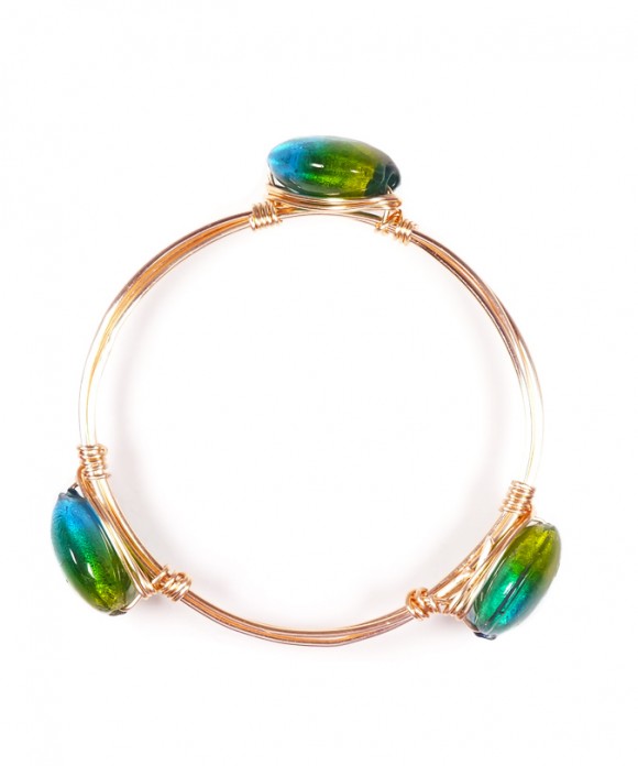 This Bracelet features a Gold Bangle with three Blue-Green Foil Glass Round Beads (20 mm) attached.
