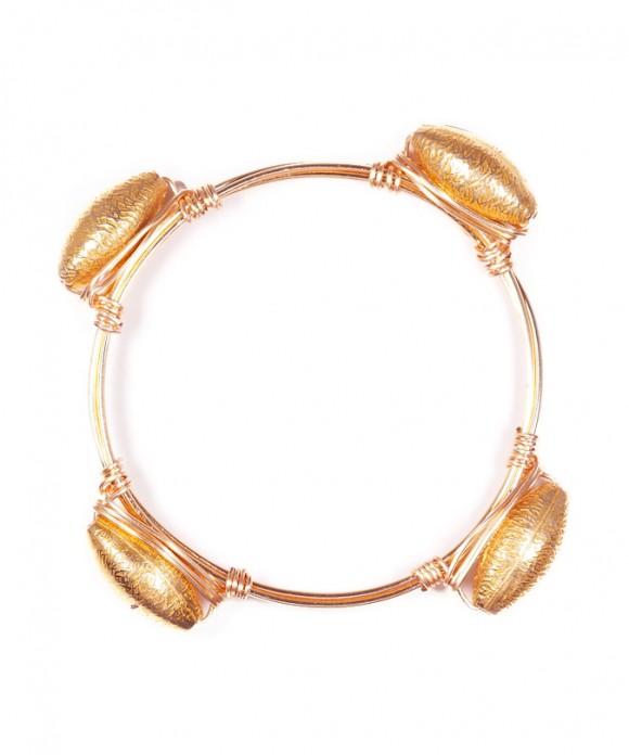 This Bracelet features a Gold Bangle with Four 18 K Gold Overlay Mesh Pattern Oval Beads (22×10 mm) attached.