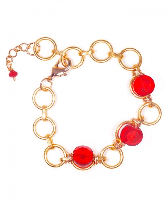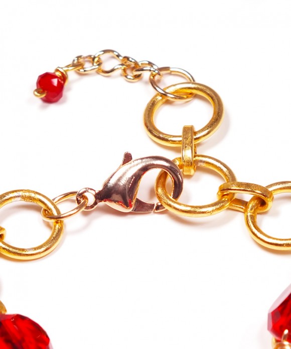 This Bracelet features a Gold Filled round chain with three faceted red flat-round Czech crystals (8 mm) to enhance it. The Lobster lock ( 10×8 mm) and the extension chain ( 1″ ) are also gold filled.