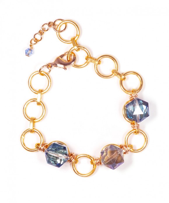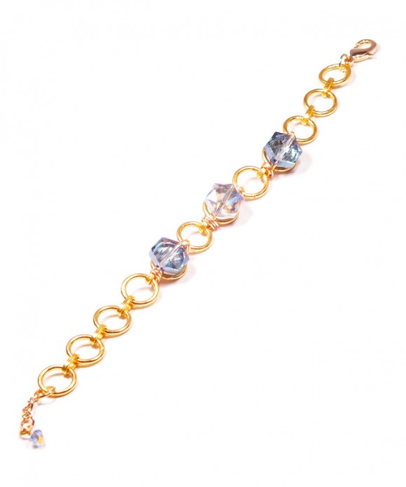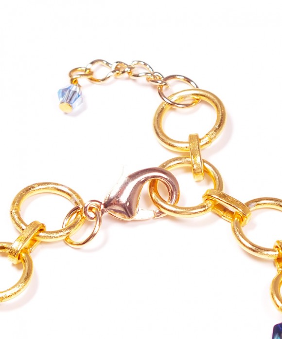 This Bracelet features a Gold Filled round chain with three faceted blue flat-round Czech crystals (8 mm) to enhance it. The Lobster lock ( 10×8 mm) and the extension chain ( 1″ ) are also gold filled.