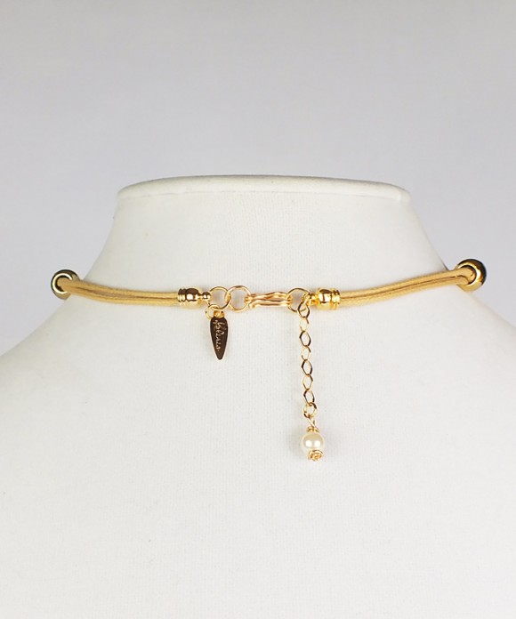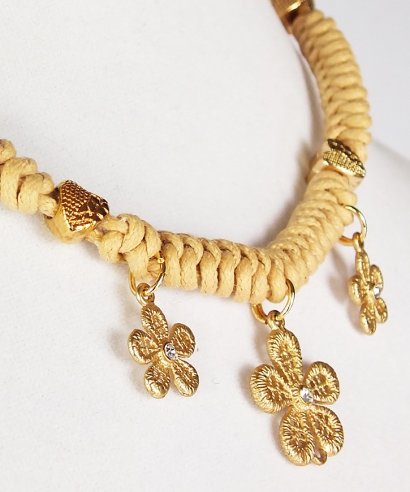 This necklace features a beige cotton cord, knotted with Gold Baroque Hearts ( 6 mm) in between, and one braided flower hanging at the center (20×20 mm) and two smaller braided flowers hanging on each side ( 15×15 mm), all three flowers with a diamond dot at the center. It also features a Gold Filled extension chain ( 1.5″ long).