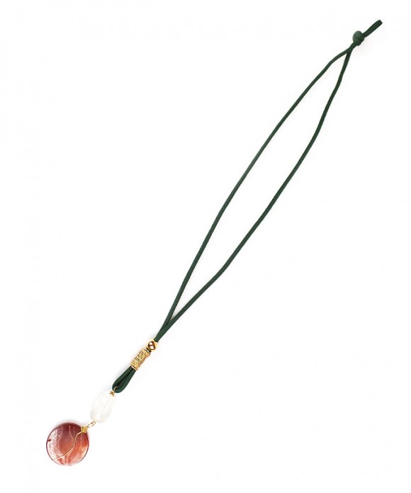 This Necklace features a dark green parachute cord, that holds at the end a big flat round polished carnelian stone ( 36 mm), and an irregular shape quartz stone ( 25-30 mm) You may wear at full length or control the length you wish by sliding the polished gold filled big hole round bead (10 mm) to the top of the cord, and once you have it on, slide it again to reduce the length to your personal choice.