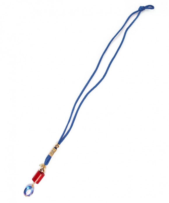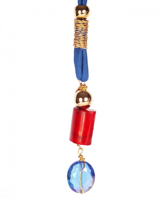 This Necklace features a navy blue parachute cord, that holds at the end an oval faceted blue crystal (20 mm), a red coral nugget (20×18 mm), and a polished gold filled round ball (14 mm). You may wear at full length or control the length you wish by sliding the polished gold filled big hole round bead (10 mm) to the top of the cord, and once you have it on, slide it again to reduce the length to your personal choice.