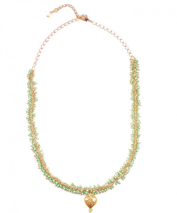 This necklace features a mini round light green cluster beads ( 2 mm) chain with a baroque puffed gold filled heart at the center ( 14 mm) and a light green faceted round mini crystal bead on the end of the heart. The Lobster Lock ( 12×6 mm) and the chains are Gold Filled