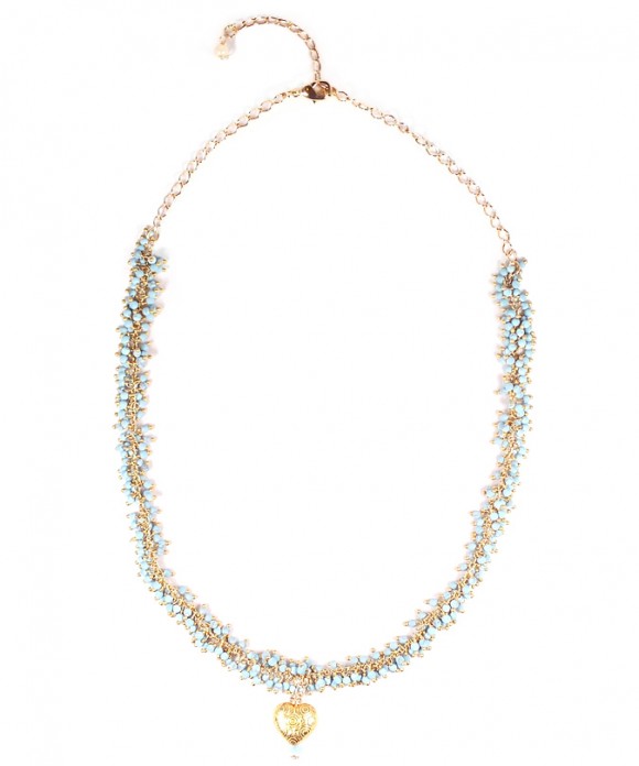 This necklace features a mini round light blue cluster beads ( 2 mm) chain with a baroque puffed gold filled heart at the center ( 14 mm) and a light blue faceted round mini crystal bead on the end of the heart. The Lobster Lock ( 12×6 mm) and the chains are Gold Filled