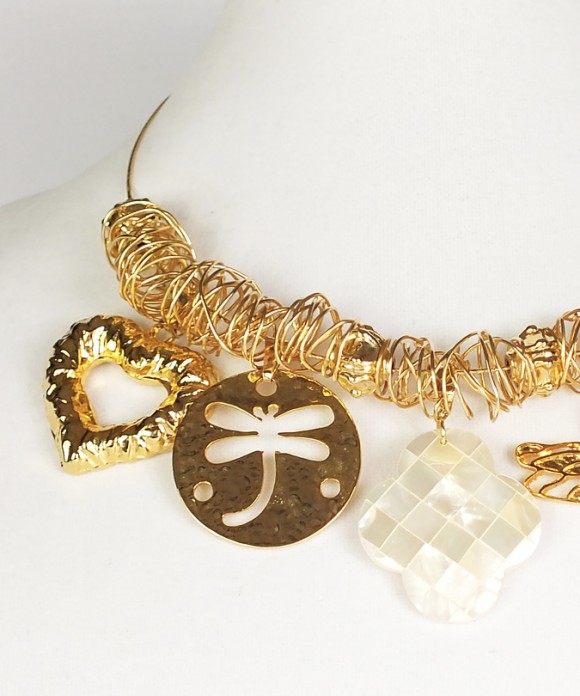 This necklace features a coil wire work made with 18 K Gold Filled Wire, with Five Different Gold Filled Charms hanging in between the wires. The Mother of Pearl (42×36 mm), the Dragon Fly (45×38 mm), the Dragon Fly Coin ( 38 mm), the heart (40×35 mm), the cross (44×33 mm). The Gold Filled Lobster Lock ( 15×10 mm) is big for easier handling.