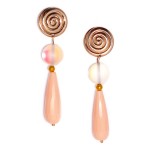 These earrings feature a Smoky Triangular Faceted Crystal (15×15 mm) and a Baroque Printed Gold Filled Faceted Almond Piece (24×12 mm) and a Polished Twelve Petals Gold Filled Flower Earstud (18 mm).