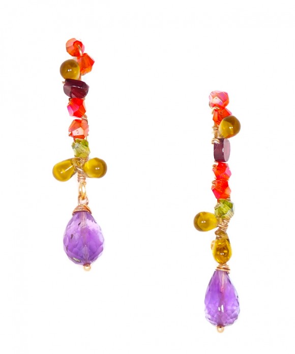 These Hoop Earrings are Light and Colorful, they feature purple amathyst, tangerine crystals and peridot green mini rondelles or bicones (2-6 mm), ending with a Crystal Faceted Amathyst Teardrop (10×8 mm). You may also like the necklace and the bracelet that match !