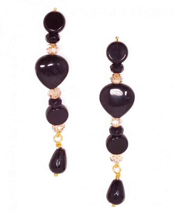These earrings feature an all-black onyx bead sequence in different shapes (4-15 mm), with two golden crystal faceted rondelles (4 mm) in between, and at the end hangs a black onyx faceted Teardrop (10×8 mm).