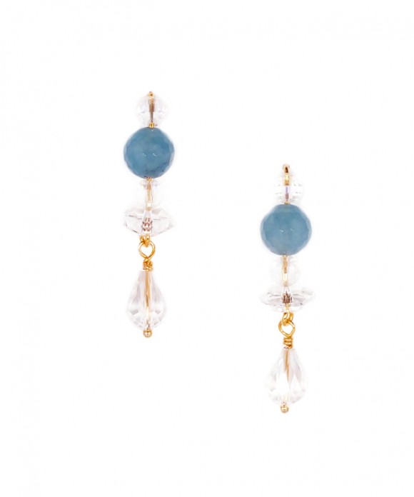 These earrings feature a light blue faceted round Agate bead with multi-faceted clear Crystal round bead (6 mm), a faceted clear Crystal disc (10×4 mm) and a Faceted Clear Crystal teardrop (12 x 6 mm).