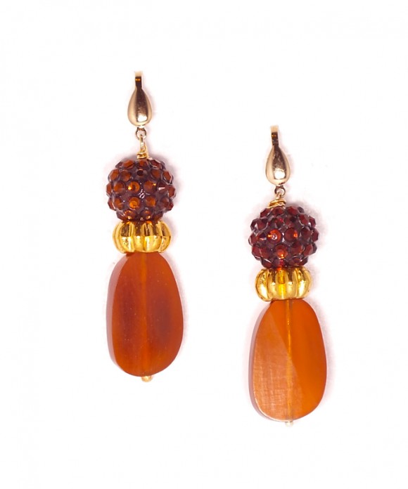 These earrings feature a brown bone oval bead (25×14 mm), with a brown diamond pave bead (14 mm), separated by a Gold Round Separator beads (12 mm).