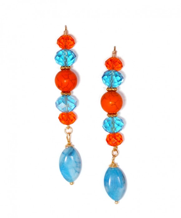These earrings feature an orange-blue-turquoise sequence using Orange and Turquoise Faceted Crystal Rondelles (10-12 mm), an Orange Howlite Round Stone (12 mm), ending with a Flat Oval Turquoise Blue Howlite Stone (20×10 mm).