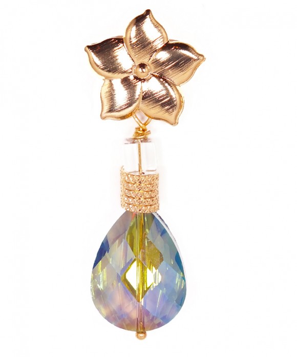 These earrings feature a Green-Blue Faceted Crystal Teardrop (25×18 mm) and a Clear Crystal Cube (6×6 mm) separated by an Engraved Gold Filled Spiral Tube (7×8 mm), hanging from a five petal Brushed Gold Filled Flower Earstud (22 mm).