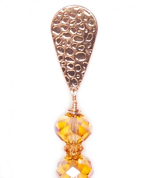 These earrings feature a sequence of Small (6 mm) and Medium (12 mm) Golden Faceted Crystal Rondelles, ending with a Golden Faceted Crystal Heart (20×15 mm), all hanging from an Inverted Hammered Gold Filled Teardrop Earstud (28×14 mm).