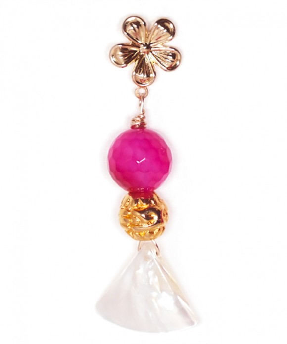 These earrings feature a big Faceted Fuchsia Quartz Round Bead ( 14 mm), a Mother of Pearl Triangular Bead (25×20 mm), separated by a Gold Baroque Round Bead (10 mm), all hanging from a Gold Filled 5-petal Flower Earstud (15 mm).