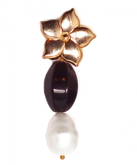 These earrings feature a Black Onyx Faceted Oval Bead (20 mm) and an Oval Baroque Freshwater Pearl (16 mm) hanging from a five-petal Brushed Gold Filled Earstud.