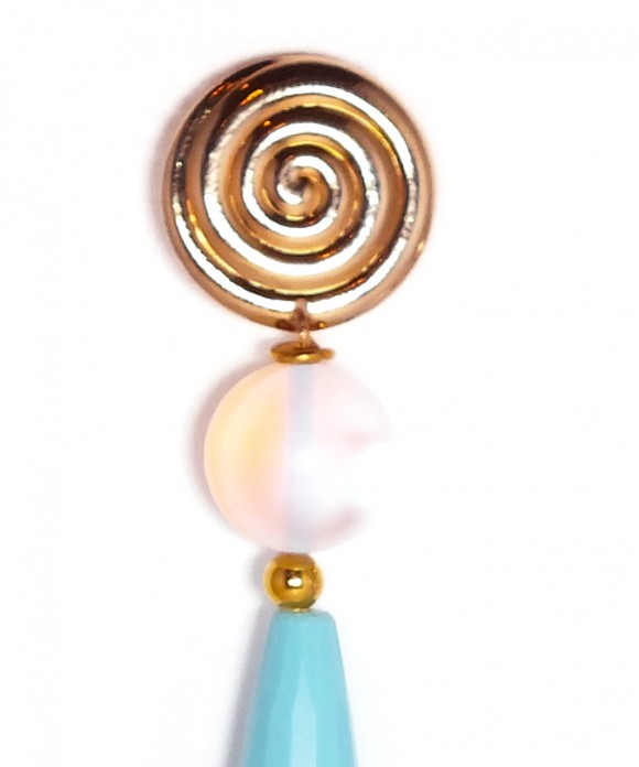 These earrings feature a Turquoise Blue Faceted Jade Teardrop (30 mm) and a round Moonstone bead (12 mm), separated by a small Gold Filled Round Bead (4 mm). They also feature a solid spiral design Gold Filled Earstud (18 mm).