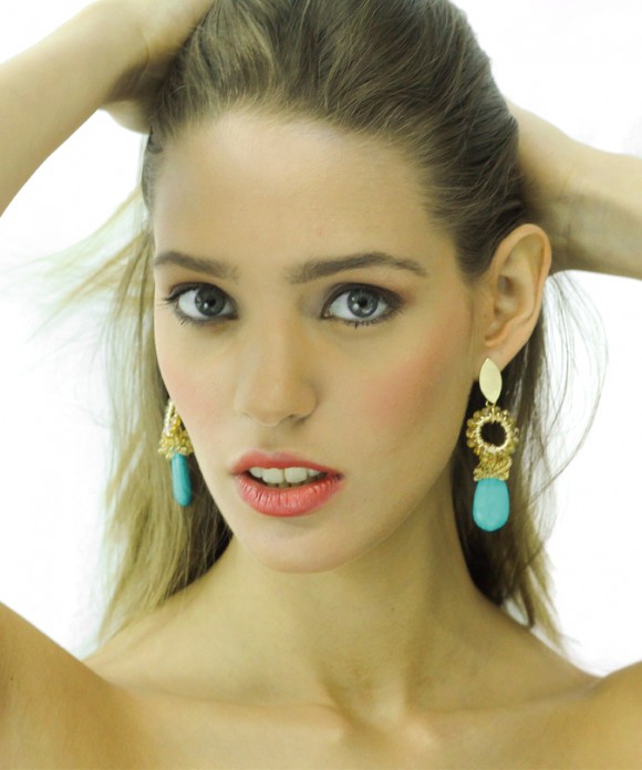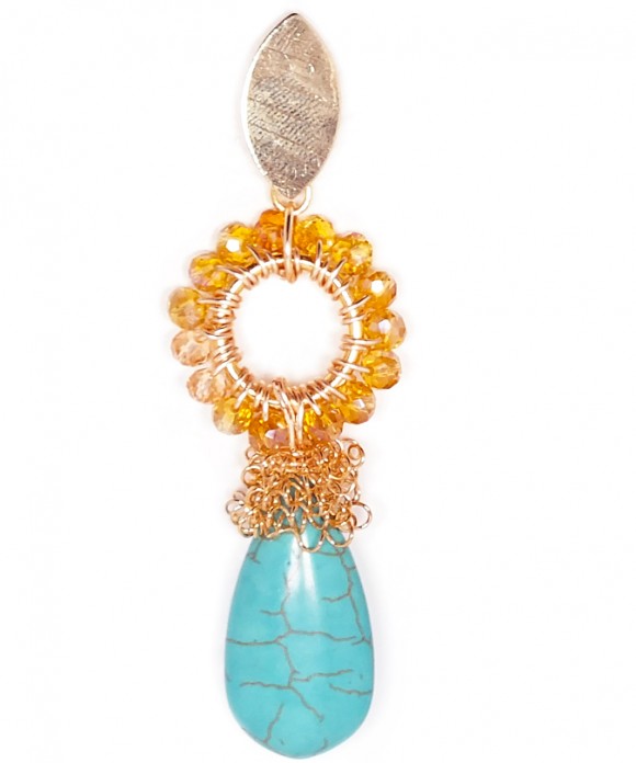 These earrings feature a Howlite Turquoise Smooth Teardrop (28 mm) with a Handmade Ring (16 mm) of Golden Crystal Faceted Rondelles (4 mm) that holds it, both covered where they meet by a Coil Tangled Gold Filled Wire. The earstud is an Oval Brushed Gold Filled Earstud (16×10 mm)
