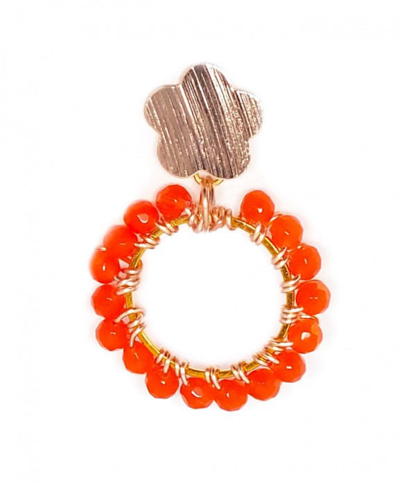These earrings feature a ring (20 mm) covered with Coral Faceted Crystal Rondelles (4 mm). They hang from a Brushed Gold Filled Flat Round Flower earstud (14 mm).