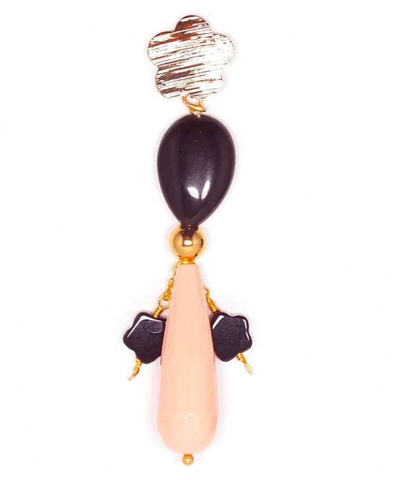 These earrings feature a Light-Pink Faceted Jade Teardrop (30 x 10 mm) with two Black Onyx Mini Stars (10 mm) hanging from a Gold Filled Mini Chain and a Black Polished Onyx Inverted-Teardrop (12 mm), separated by a Round Polished Gold Filled Bead (6 mm). The earstud is a five-petal Brushed Gold Filled Flower (14 mm). Check out the matching Necklace !!!