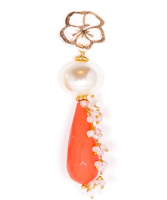 These earrings feature a Freshwater Pearl Nugget (16 mm) and a Coral Faceted Jade Teardrop (40 x 15 mm), which is surrounded by a White Mini-Quartz Gold Filled Chain Cascade. The Flower Earstuds (20 mm) and the daisies are also Gold Filled.