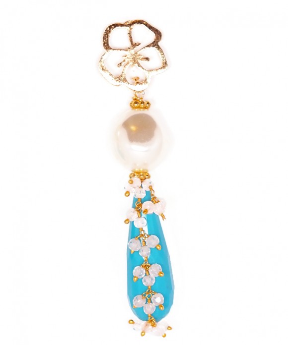 These earrings feature a Freshwater Pearl Nugget (16 mm) and a Turquoise Blue Faceted Jade Teardrop (40 x 15 mm), which is surrounded by a White Mini-Quartz Gold Filled Chain Cascade. The Flower Earstuds (20 mm) and the daisies are also Gold Filled.
