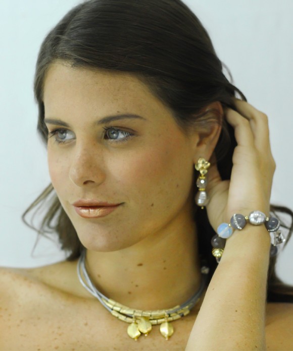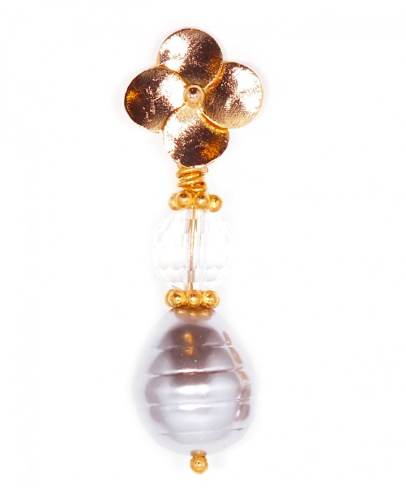 These earrings feature a Light Grey Baroque Oval Freshwater Pearl (16 mm) and a Multi-Faceted Round Clear Crystal (10 mm) hanging from a Four-Petal Gold Filled Flower (15 mm). The daisies are also Gold Filled. You may also like our matching grey necklaces or bracelets.