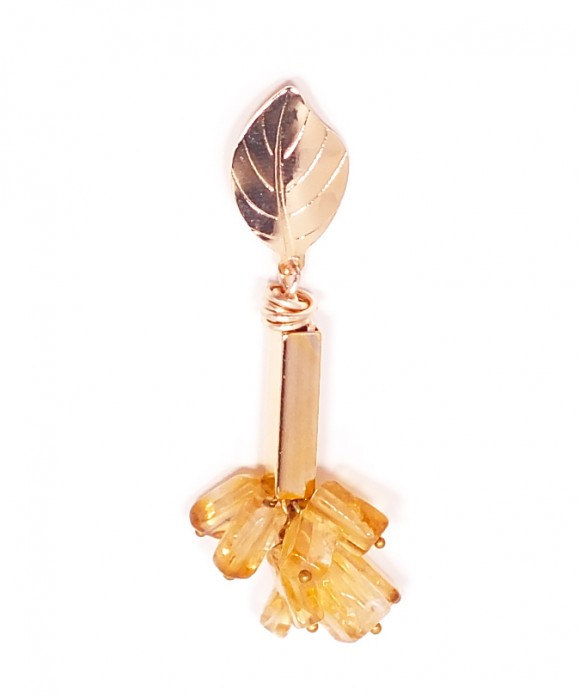 These earrings feature a mini rectangle Citrine Cluster hanging from a Gold Filled Squared tube (18×4 mm). The earstud is a polished Gold Filled Leaf (18×12 mm).
